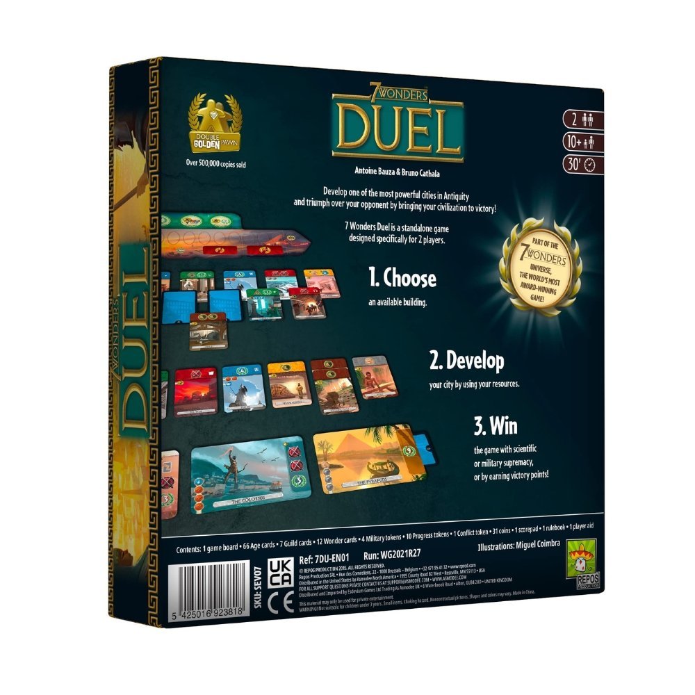 Build a powerful civilization in just 30 minutes with 7 Wonders Duel, the acclaimed two-player version of the hit game 7 Wonders. Compete in military, science, and trade as you draft cards and construct Wonders to outsmart your rival. Compact, strategic, and endlessly replayable perfect for fans of competitive board games.