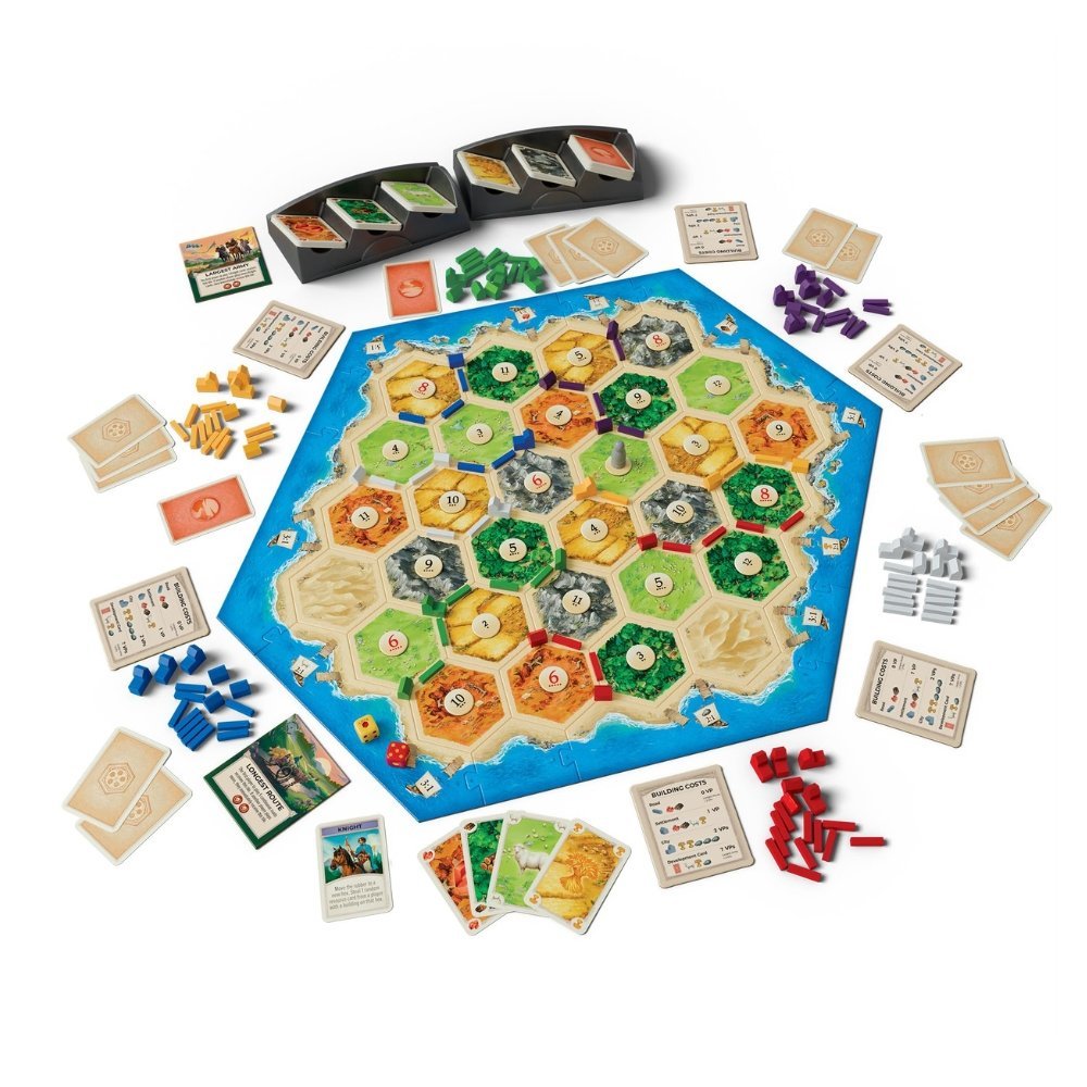 • Includes: Extra terrain hexes, resource and development cards, additional roads, settlements, cities, and game pieces for 2 more players