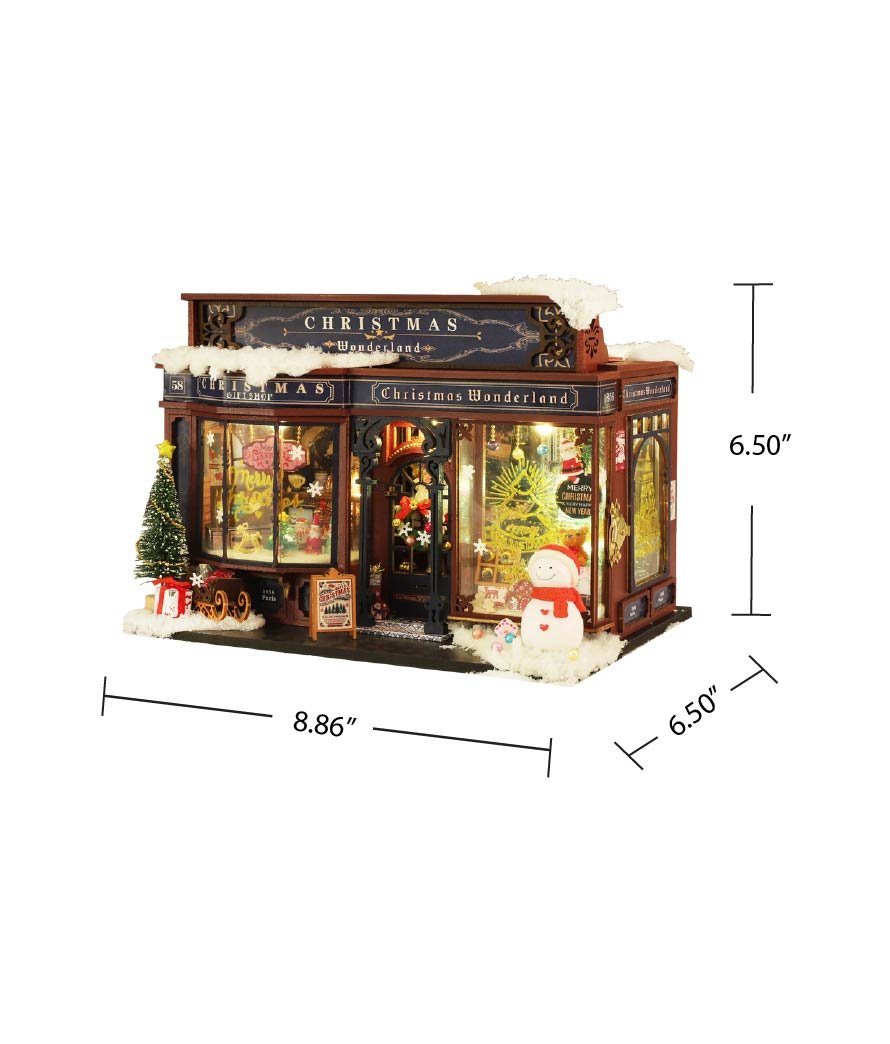 Crafted with classic wooden panels, frosted windows, and a cozy glow, this miniature holiday shop brings a timeless Christmas scene to life. Through the decorated windows, you’ll spot shelves lined with tiny toys, wrapped gifts, and glittering ornaments. Inside, a beautifully trimmed Christmas tree stands proudly-while just outside, a friendly snowman welcomes visitors with a cheerful smile, adding the perfect touch of winter wonder.