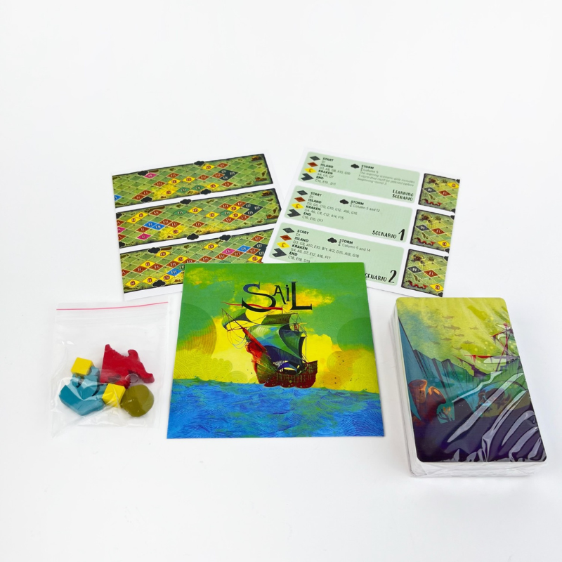 Sail board game,  two players must cooperate using trick-taking mechanics to steer their ship past storms and dangers while avoiding the mighty Kraken. With tight communication and clever planning, only true teamwork leads to victory!