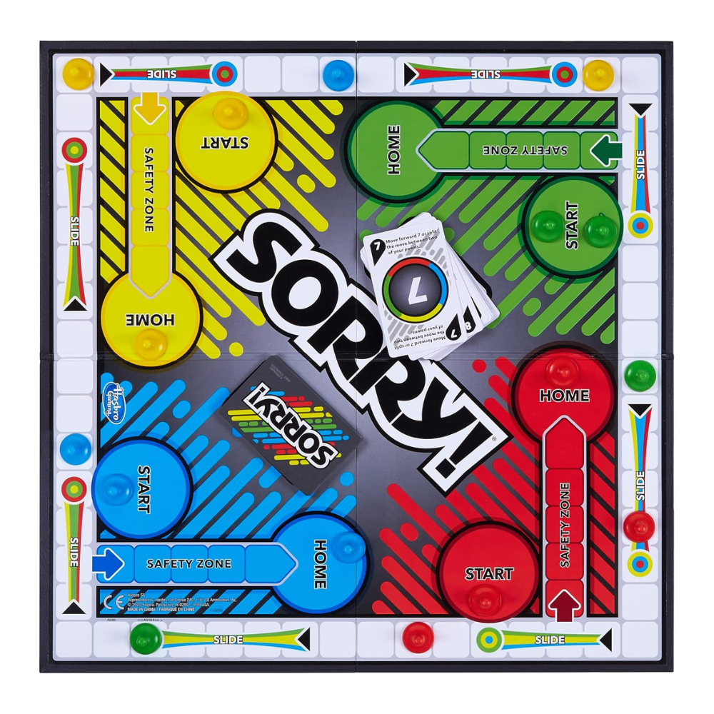 Slide, bump, and race your way to victory! SORRY! is the iconic board game of sweet revenge where players race their pawns around the board to get all of them “home”—but watch out! One wrong move and you’ll be sent back to the start.
