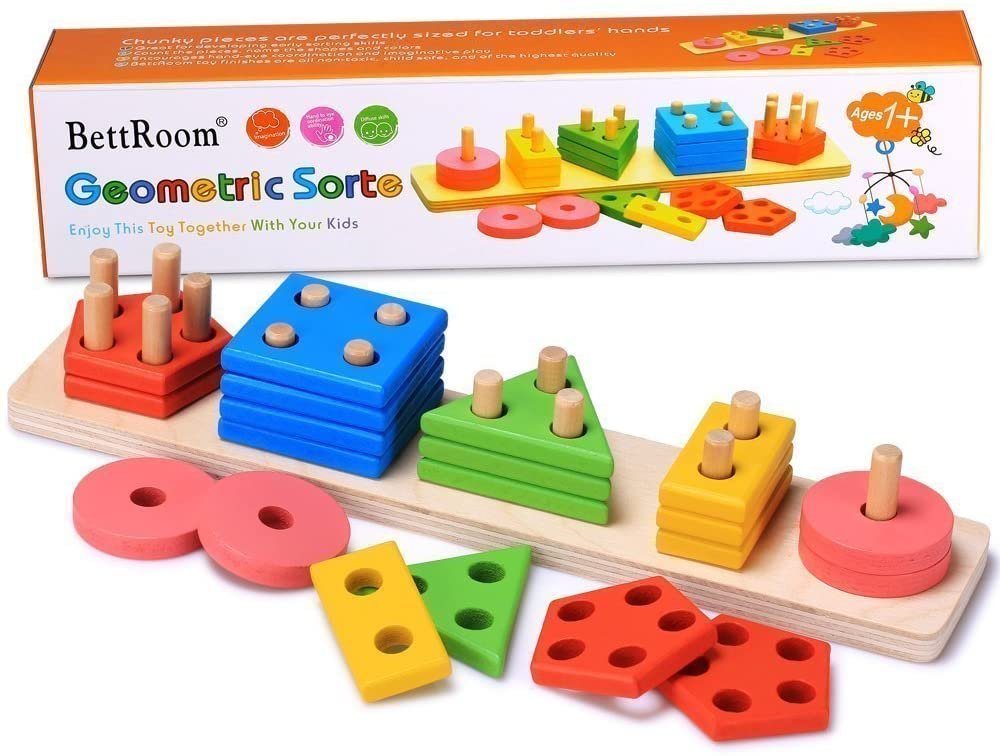 Kids will know these five different shapes incredibly well by the time they finish playing with the Stacking Tiles Progression. Here are several tiles-high stacks of shapes such as a square, triangle, rectangle, circle, and even a pentagon! Each shape has different amounts of holes, such as the triangle that has three, the circle that has one, and the pentagon that has five! There are 20 pieces in total, and kids can stack them at their leisure and learning.